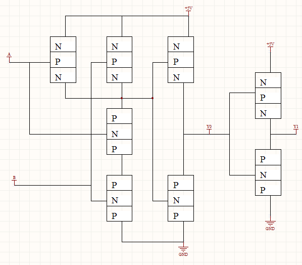 在用注塑机将这些PN节包裹在PBT工程塑料中,再在PBT塑料外面用硫化剂把甲基乙烯基硅橡胶混炼胶包裹起来。这样整个加成电路就处于高绝缘环境中。在上图中,在这个集成电路的A段输入10KV的正电压,在这个集成电路的B端输入10KV的正电压,Y0端输出10KV的正电压,Y1端输出10KV的负电压。这样就制作成了一个高电压的集成电路。